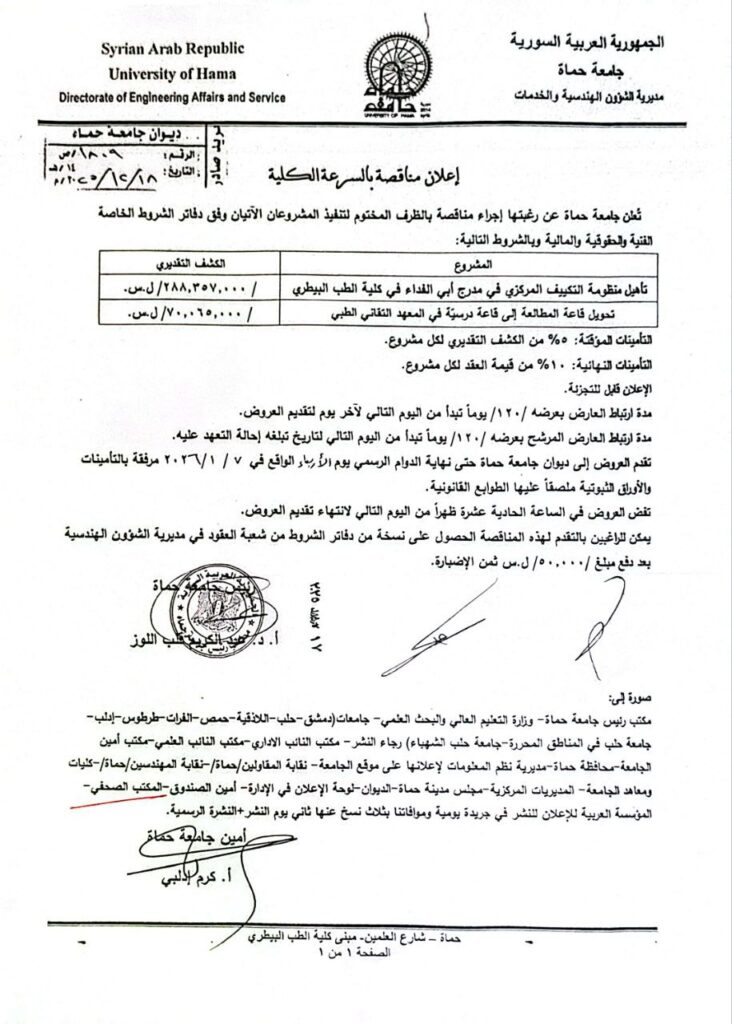 تعلن جامعة حماة عن رغبتها إجراء مناقصة بالظرف المختوم لتنفيذ المشروعان الآتيان وفق دفاتر الشروط الخاصة الفنية والحقوقية والمالية بالشروط التالية المرفقة بالإعلان