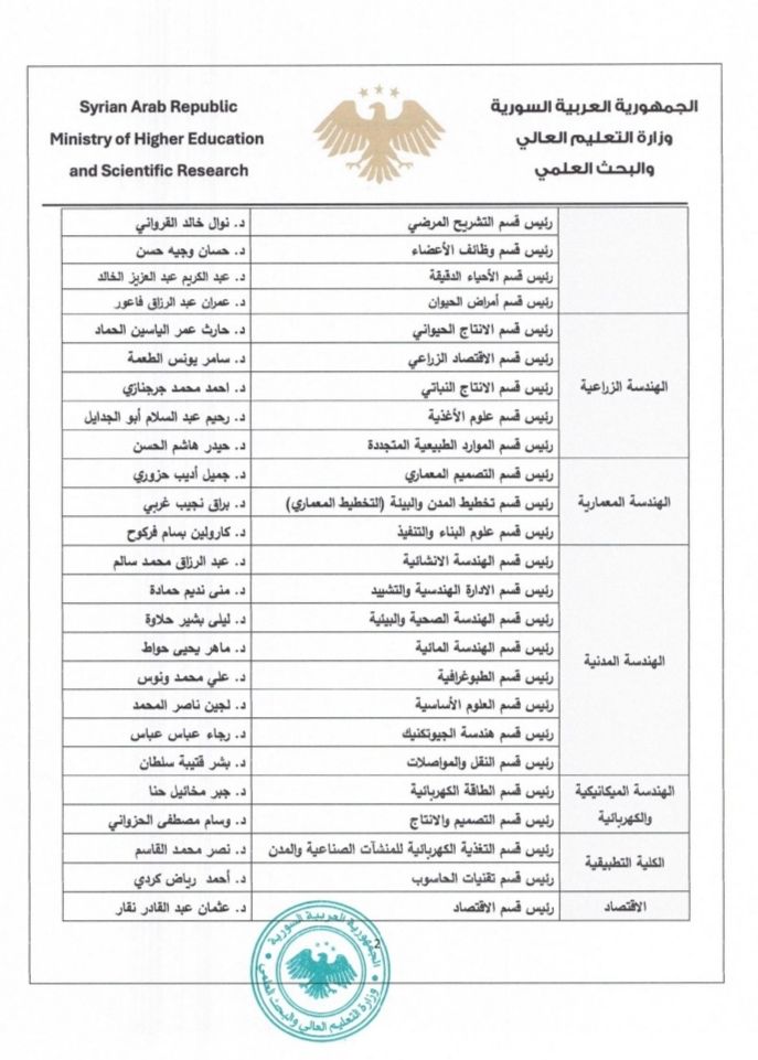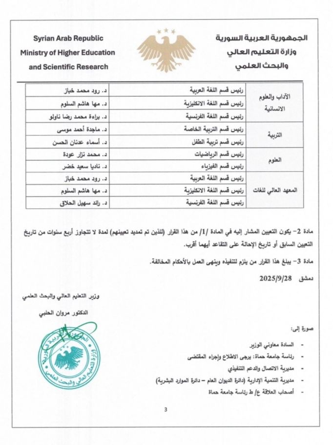باقتراح من السيد الأستاذ الدكتور “عبد الكريم قلب اللوز ” رئيس جامعة حماة، يعين كل من السادة التالية اسماؤهم من أعضاء الهيئة التدريسية بجامعة حماة برئاسة القسم المبين جانب كل اسم منهم لمدة سنتين اعتباراً من تاريخ 2025/9/29 وذلك على القرار المرفق بالصور التالية .