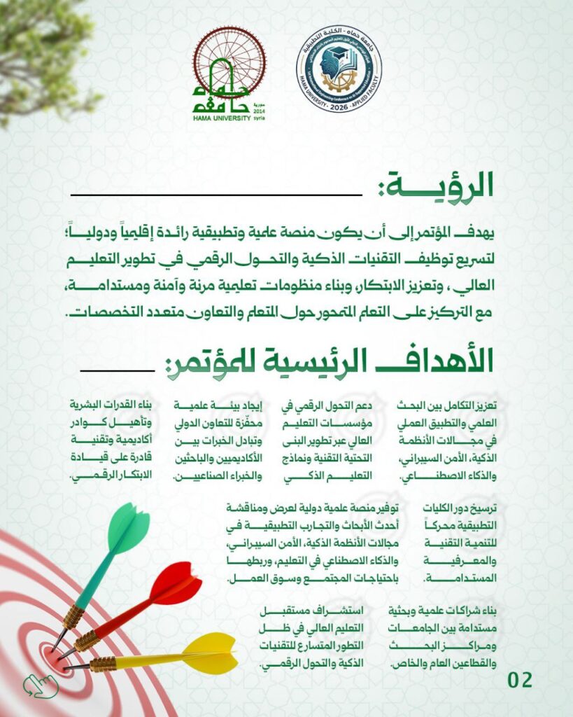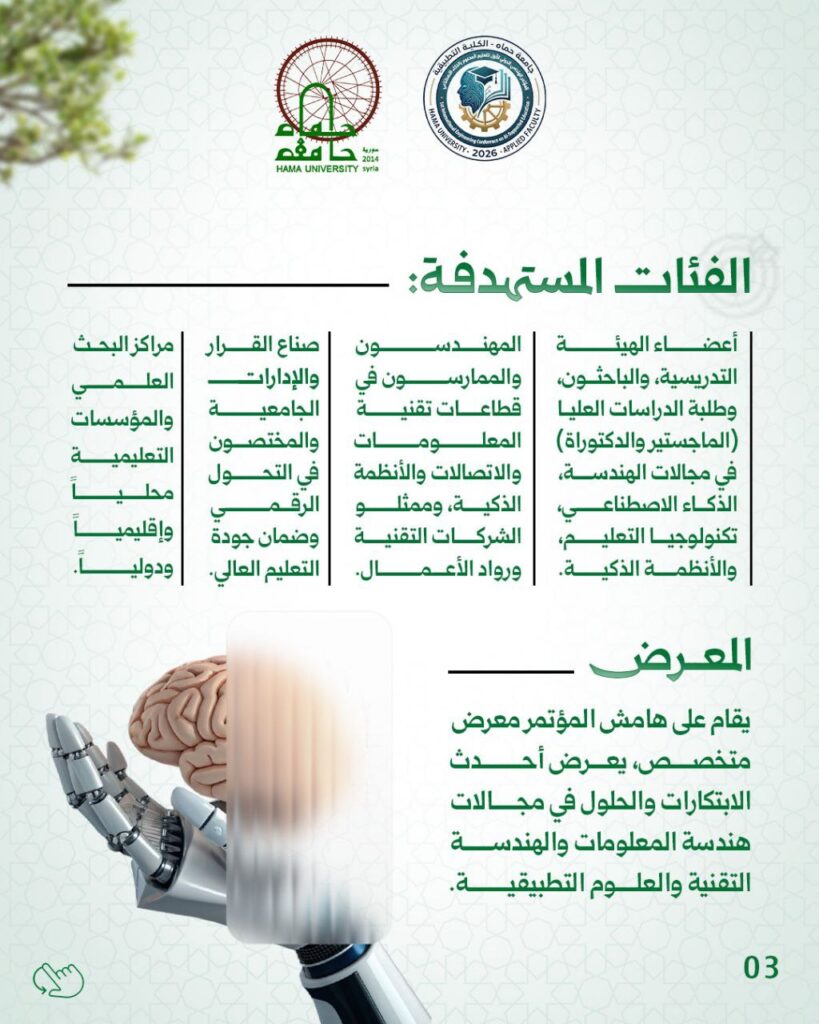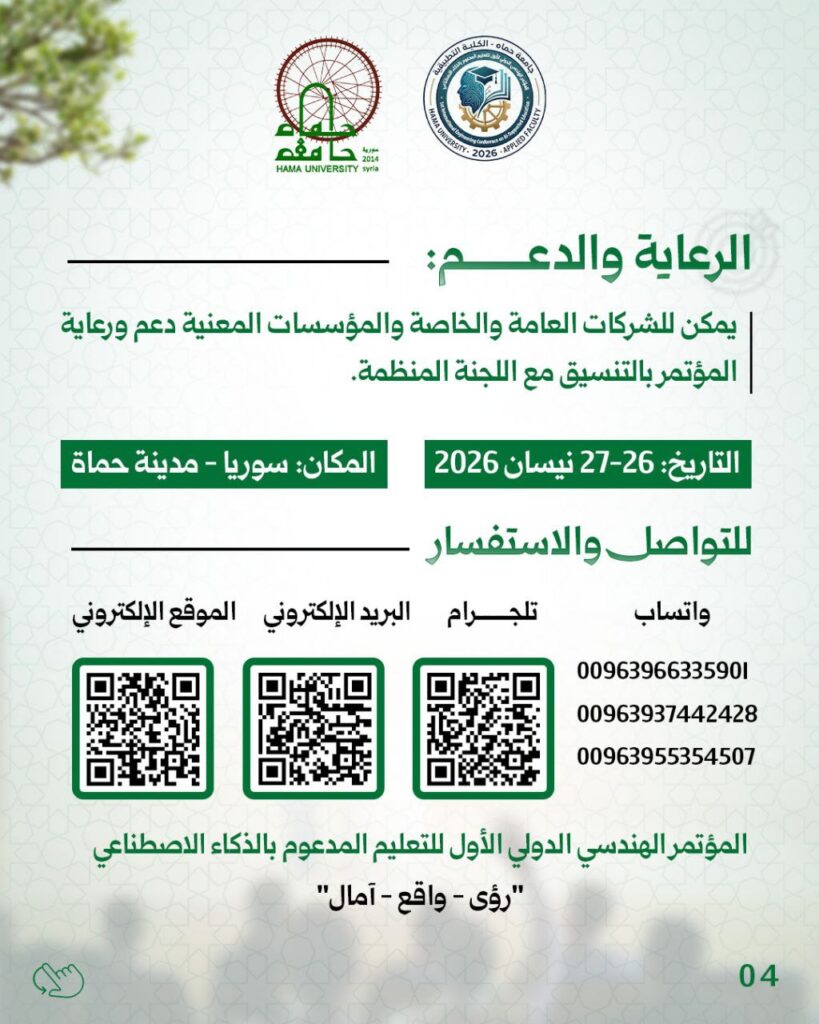 تعلن جامعة حماة عن إطلاق “المؤتمر الهندسي الدولي الأول للتعليم المدعوم بالذكاء الاصطناعي” الذي تستضيفه الكلية التطبيقية.