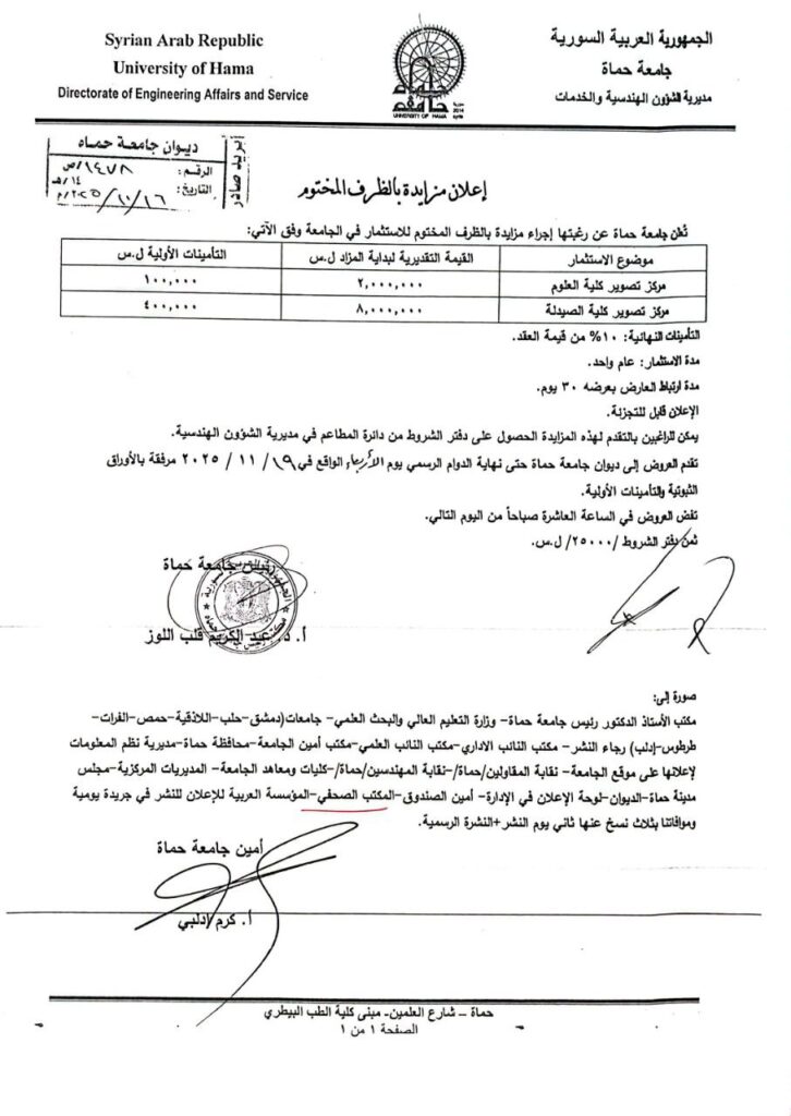 تعلن جامعة حماة عن رغبتها بإجراء إعلان مزايدة بالظرف المختوم للاستثمار في الجامعة.أكتوبر 19, 2025 المقالة السابقة في كلية العلوم بجامعة حماة، يجتمع عُمق الرياضيات وسِحر الفيزياء لصياغة عقول تبحث، تُحلّل، وتبتكر. المقالة التالية إعلان تمديد المفاضلة العامة للعام الدراسي للعام 2025-2026