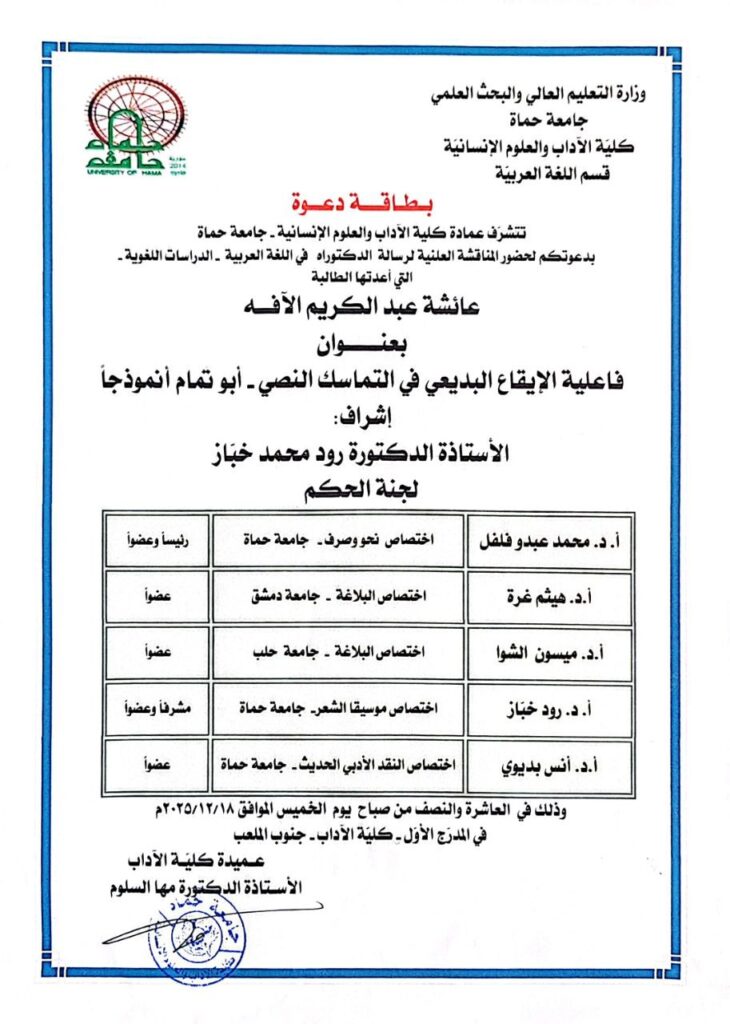 عمادة كلية الآداب والعلوم الإنسانية في جامعة حماة تتشرف بدعوتكم لحضور المناقشة العلنية لأطروحة الدكتوراه في اللغة العربية للباحثة “عائشة عبد الكريم الآفة”، والموسومة بعنوان: “فاعلية الإيقاع البديعي في التماسك النصي – أبو تمام أنموذجاً”، وهي أول مناقشة دكتوراه تُقام في الكلية منذ افتتاحها.