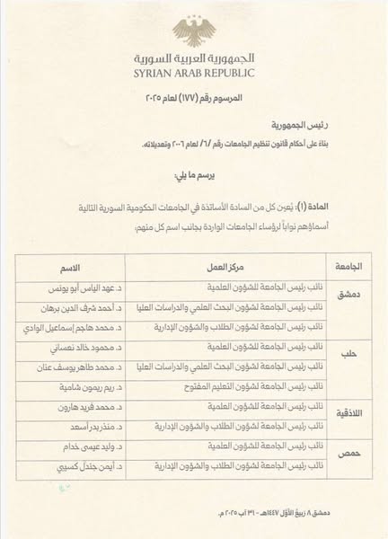 باقتراح من السيد الأستاذ الدكتور “عبد الكريم قلب اللوز ” رئيس جامعة حماة، يعين كل من السادة التالية اسماؤهم بمهام مدير/ة المعهد التقاني المبين جانب كل اسم منهم في جامعة حماة اعتباراً من تاريخ 2025/9/29 وذلك على القرار المرفق بالصورة التالية .