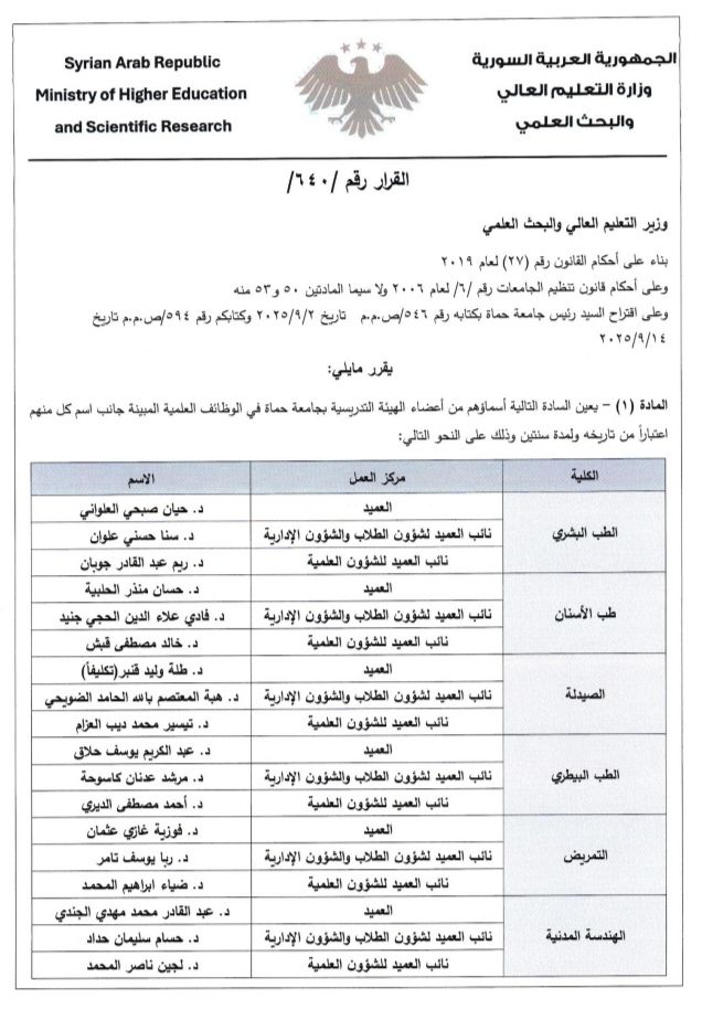 مرسوم من رئاسة الجمهورية يحمل الرقم (177) لعام 2025، يقضي بتعيين كل من السادة الأساتذة التالية أسماؤهم نواباً لرئيس جامعة حماة : – الدكتور “حسين علي العيسى” نائب لرئيس جامعة حماة للشؤون العلمية. – الدكتور “محمد عبدو فلفل” نائب رئيس…